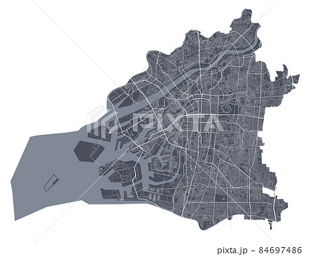 Osaka city map. Detailed black map of Osaka poster with streets, land vector.