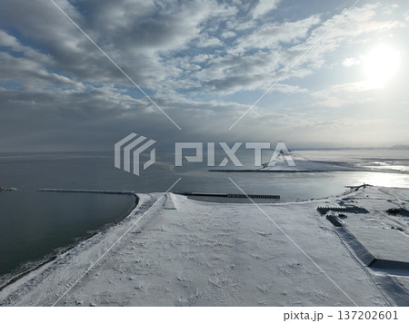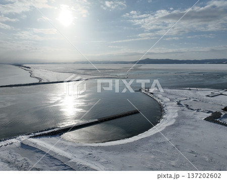 流氷片漂う冬のサロマ湖湾口とアイスブーム俯瞰