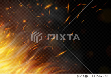 Fire. Fire sparks flying up on transparent background. Smoke and glowing particles on black. Realistic lighting sparks with bokeh effect for design. Vector illustration.