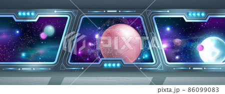 Space ship interior, vector future shuttle background, rocket window view, alien planets, stars.