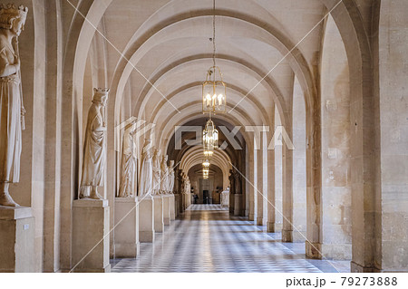 The beautiful view inside of the Empty Marble Hallway at Versaille Palace in France.
