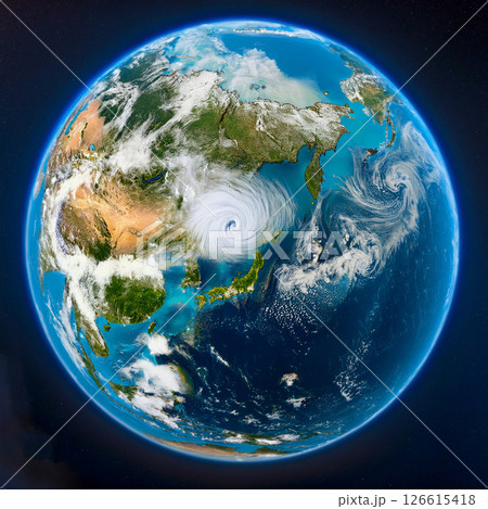 東日本に接近した大型台風と雨雲レーダーの天気図 架空(3DCGイメージ)