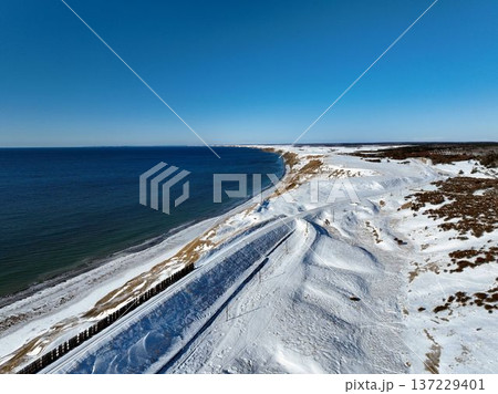 雪降る早朝の宗谷岬空撮 日本最北端の海岸