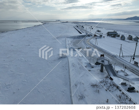 竜宮台展望台上空から俯瞰する結氷するサロマ湖半島
