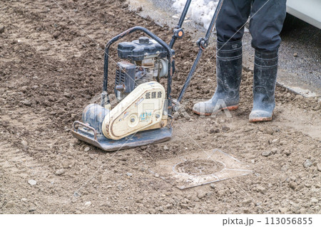 道路工事 プレートコンパクター 転圧作業