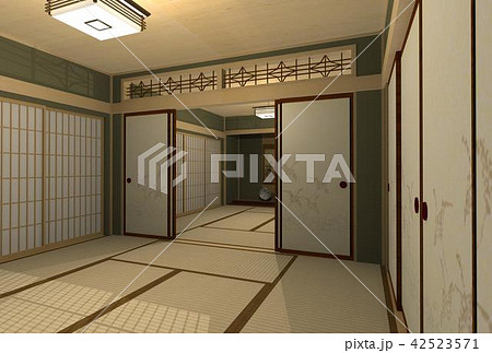 日本伝統の建築様式のイラスト。床の間、書院造。地袋や違い棚。3Dレンダリング画像。