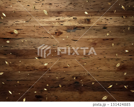枯れ葉が積もる古びた木の床の背景素材(秋の雰囲気)