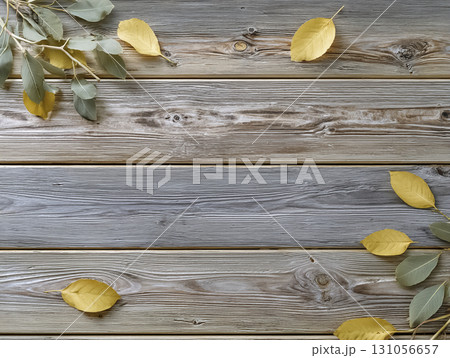 枯れ葉が落ちた古びた木の床の背景素材(秋の雰囲気)