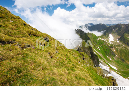 landscape of transylvania alps in summer. spots of snow among grass on the rocky slopes of fagaras range beneath a sky with clouds. popular travel destination in the mountains of romania