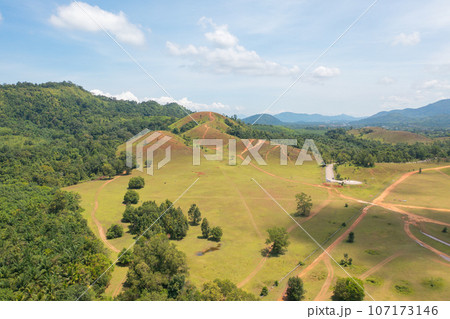 Aerial top view of Samet Nangshe, Phang Nga, lush green trees from above in tropical forest in national park in summer season. Natural landscape. Pattern texture background.