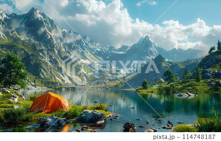 Majestic mountain landscape at sunrise, with lush greenery, clear waters, and snow-capped peaks, inviting adventurous travelers to explore its beauty