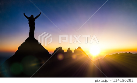 Silhouette of happy hiker man standing on mountain peak with raised hands during beautiful sunset or sunrise achievement success concept