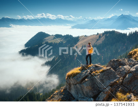 Woman with backpack on mountain ridge above a sea of clouds