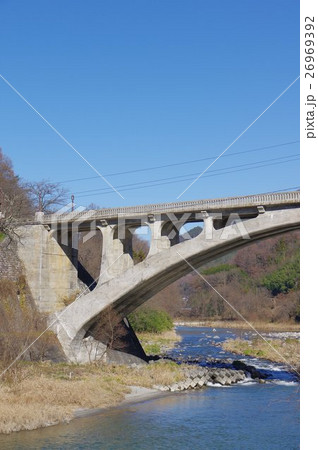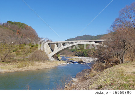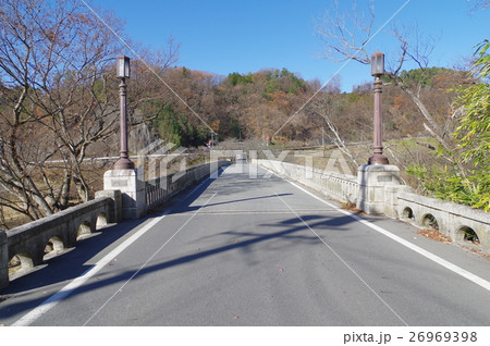 信州 中川村の坂戸橋 道路面 鉄筋コンクリート製アーチ橋としては日本一の長さ 重要文化財
