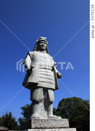 滋賀県大津市 坂本城址公園の明智光秀像と新緑