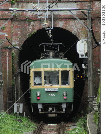極楽洞(極楽寺トンネル)を通る江ノ島電鉄300形