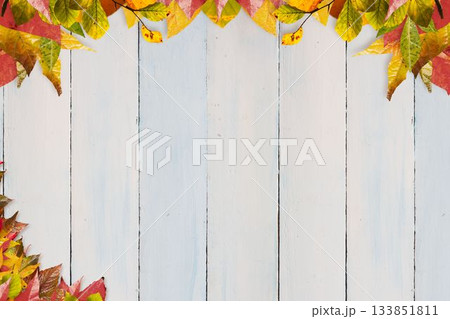 Whitewashed wooden planks are forming flat lay with scattered yellow and red autumn leaves border