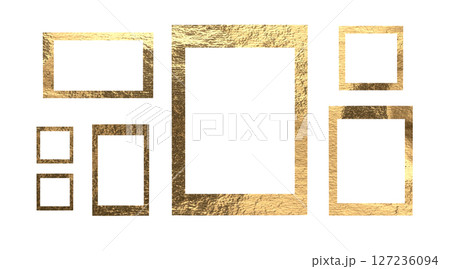 Empty frames on wall in modern gallery. Various sizes, including square, rectangle, A4, A3, in gold,