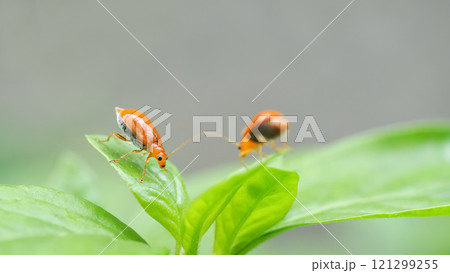 A close-up shot of two small, bright orange beetles on fresh green leaves, with a softly blurred background emphasizing the vibrant foreground details.