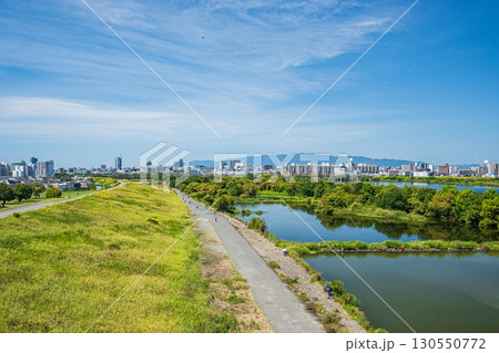 菅原城北大橋から望む淀川左岸の堤防 大阪市