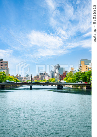 本川に架かる空鞘橋の下流域を撮影しています。市中心部の紙屋町、原爆ドームが見えます。広島県
