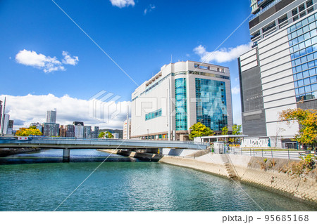 広島駅南口側、京橋町の川沿いのビル街です。正面は城南通りの上柳橋です。明るい市街地背景にどうぞ。