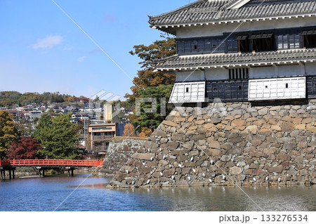 紅葉に囲まれた秋の松本城と美しい水辺の風景