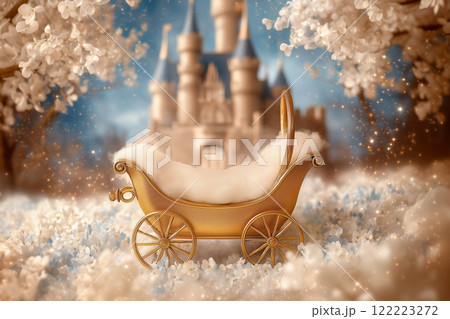Magical golden baby carriage in front of a fairytale castle with blossoming trees Newborn backdrop