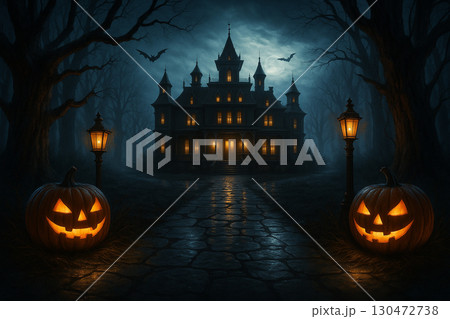 AI generated haunted Halloween scene with glowing jack o lanterns lining a dark path leading to an abandoned gothic house under a mystical sky