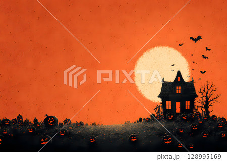 Spooky Halloween poster with haunted house, bats, and pumpkin lanterns in orange-black color tone. Perfect for ready-to-use party invitations, ads, or social posts.