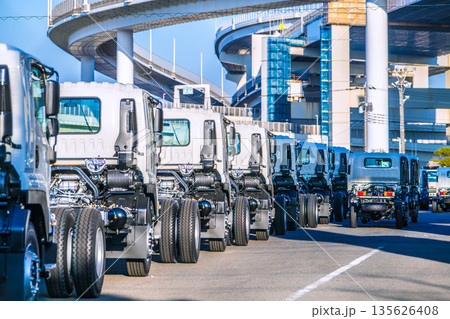 日本の横浜都市景観 日本経済…ズラリと並ぶトラック
