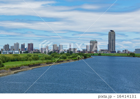 青空が広がる荒川の船留まりと川口元郷の高層ビル群