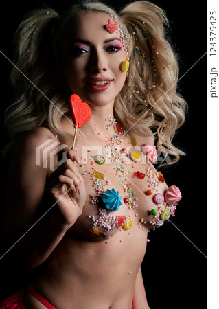 Beauty and body art create a playful and colorful atmosphere with sweets
