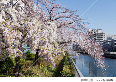 大横川の堤防沿いに咲く満開の桜の花