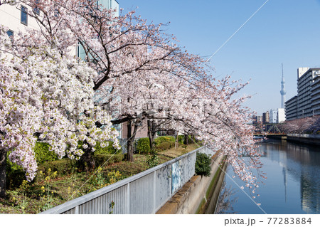 大横川の堤防沿いに咲く満開の桜の花とスカイツリー