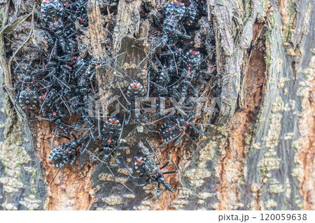 木の幹にかたまるヨコヅナサシガメ幼虫の群れ