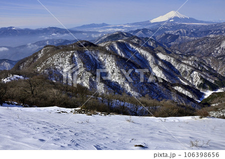 森から望む雪景色の富士山 丹沢の大倉尾根 小草平