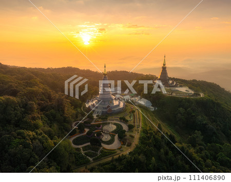 aerial view Twin pagoda built on top of the mountain Doi Inthanon at Chiang Mai in North, Thailand.