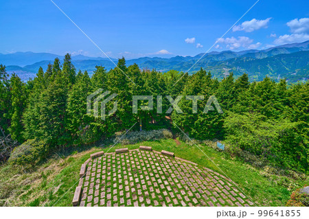 春の神奈川県秦野市の菜の花台展望台から南東側の眺望(秦野市名古木,権現山,弘法山など)