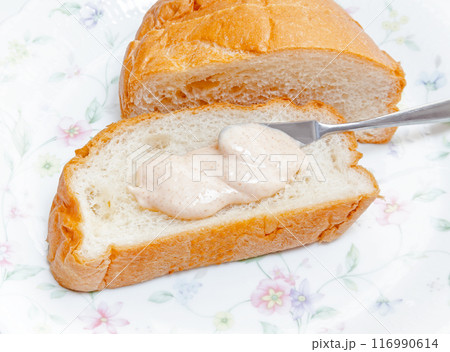 明太子入りのマヨネーズを塗ったフランスパン【白背景・切り抜き】