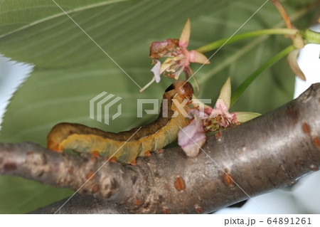 生き物 昆虫 キバラモクメキリガ、終齢幼虫。四月、街路樹の八重桜にいました