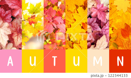 Season of year. Autumn horizontal nature banner with bright colourful leaf of maple, rowanberry and birch. Nature collage with fall seasonal scenes. Copy space for text