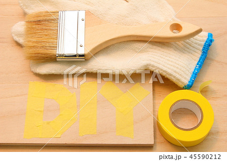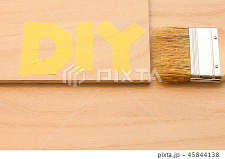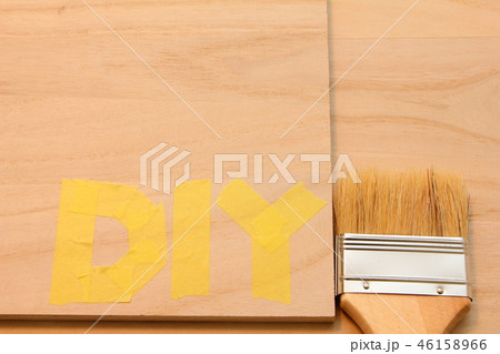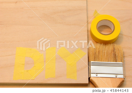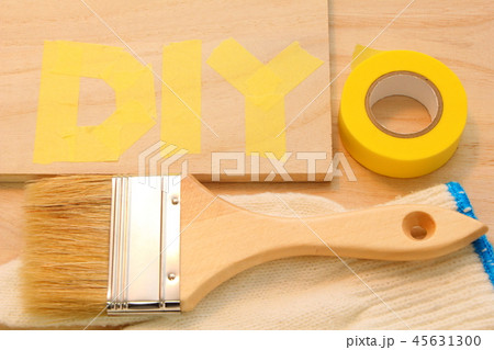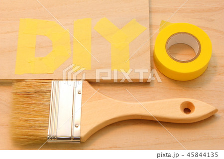 木の板の上にマスキングテープで書かれた「DIY」の文字と、刷毛。