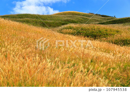 青空の下のすすきと秋の自然風景 徳島県 塩塚高原