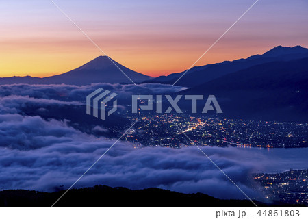 【富士山素材】秋の高ボッチ高原から見る夜明けの富士山と諏訪湖の雲海【長野県】