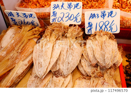 香港の乾物市場。手前はスルメ。手前右は干した蠣。奥の干し貝柱は日本の宗谷産が最高級品
