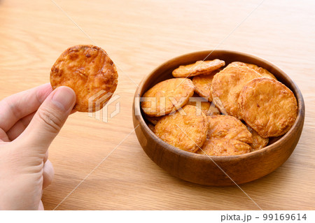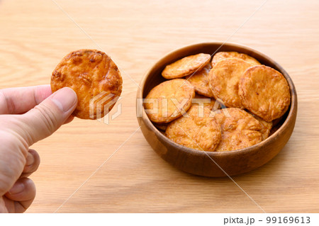 焼きせんべいを持つ手 木の器に入った煎餅 昔ながらのお菓子