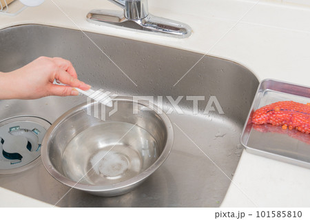 【イクラの醤油漬けを作るために、塩を入れたぬるま湯に生イクラを入れる】