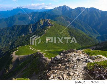 南アルプス塩見岳 山頂への道 塩見小屋越の北アルプス遠景