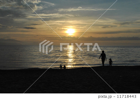 波打ち際で遊ぶ家族のシルエット